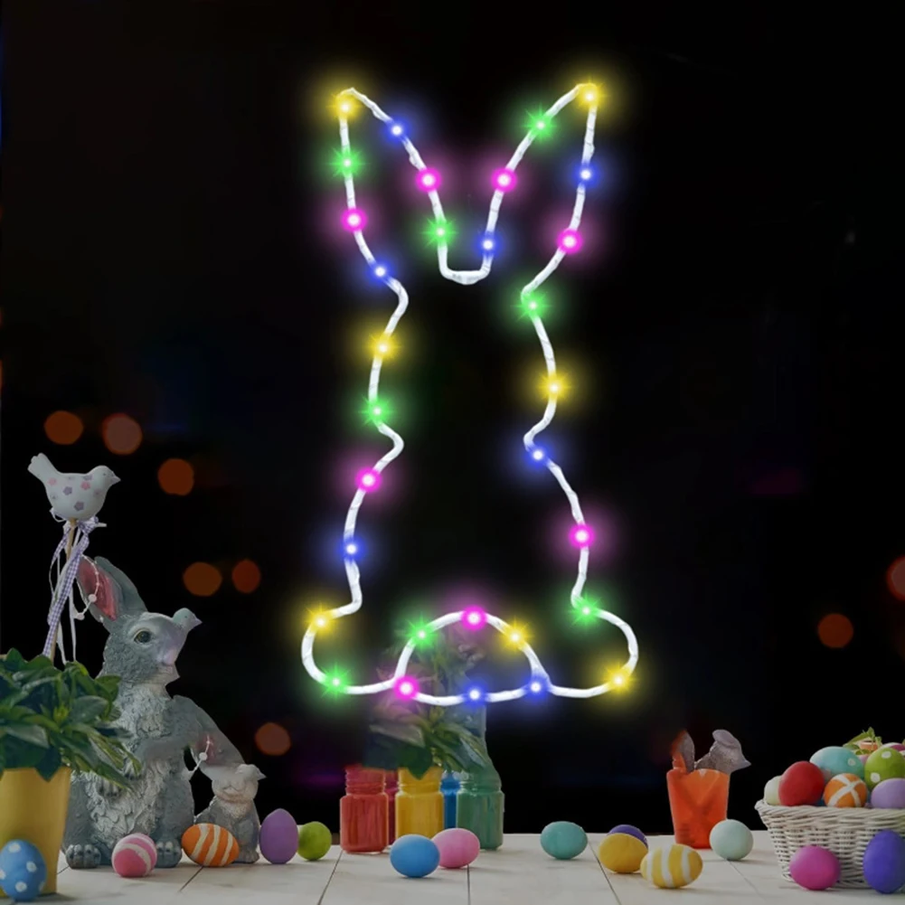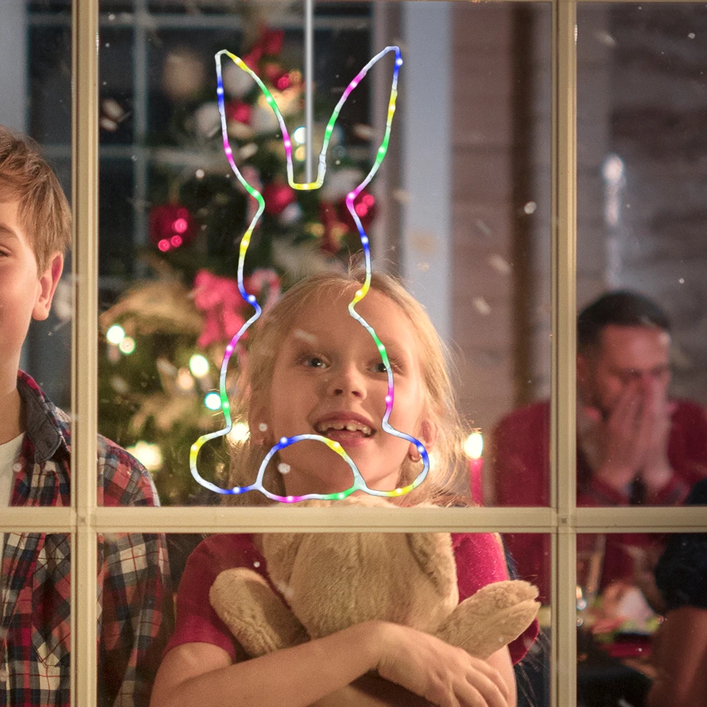 Features: 1.Unique Easter Design: Featuring a classic Easter bunny shape, this cute bunny window light combines traditional holiday elements with modern lighting technology. Perfect for home decoration or store window displays, it instantly enhances the festive atmosphere. 2.Easy Suction Installation: Equipped with strong suction cups, the luminous rabbit pendant easily adheres to windows, mirrors, and other smooth surfaces. This allows for hassle-free installation and removal without any marks or damage. 3.Soft LED Lighting: Using energy-efficient and eco-friendly LED lights, the rabbit window light provides soft, non-dazzling illumination. It creates a warm and romantic atmosphere, particularly suitable for night use, adding a bright touch to your home. 4.Smart Timer Function: The bunny window fairy lights come with a built-in timer, enabling users to set automatic on/off times as needed. This feature saves electricity and eliminates the hassle of manual operation, ensuring convenience and efficiency. 5.Versatile Usage: Ideal for Easter celebrations, these hanging fairy lights are also perfect for other holidays, parties, and weddings, adding fun and decorative flair. As a gift to friends and family, they are both practical and creative. Specification: Origin: Mainland China Size: 310.00x220.00x10.00mm/12.2x8.66x0.39inch Material: Iron, Electronic Components Power Supply: Three AA Batteries (Batteries Are Not Included In Delivery)